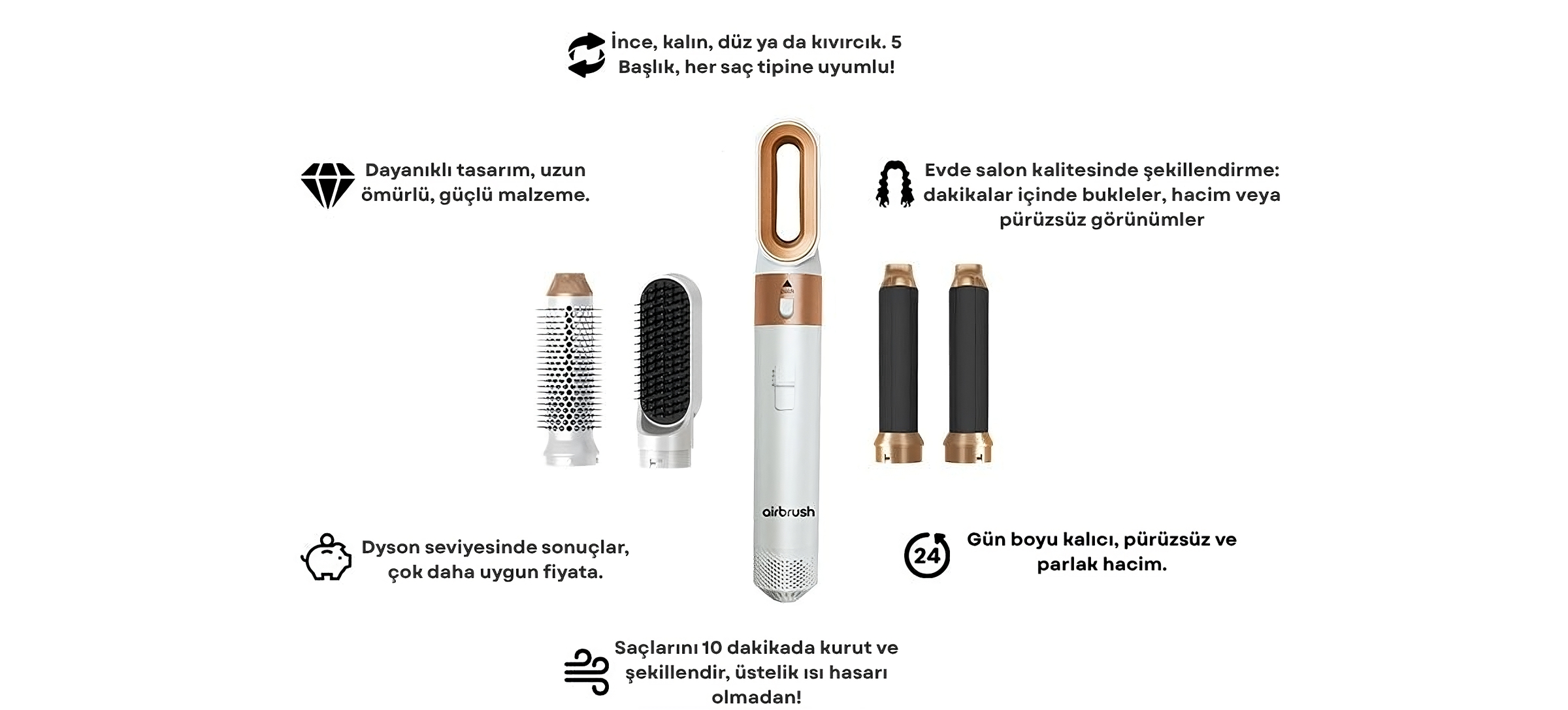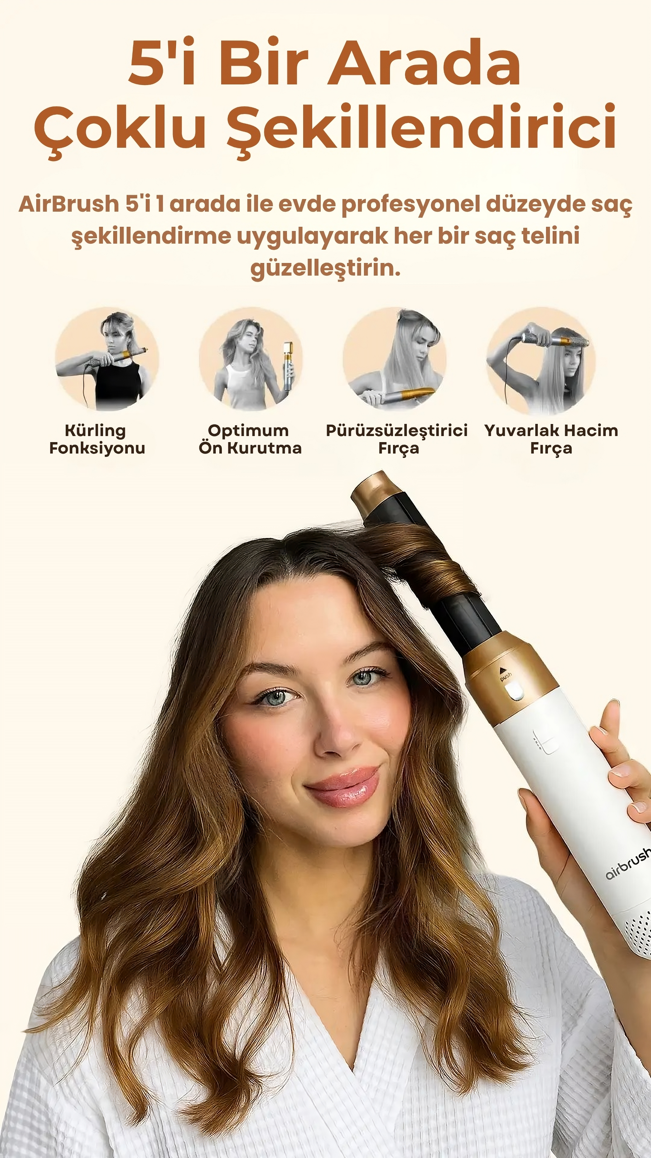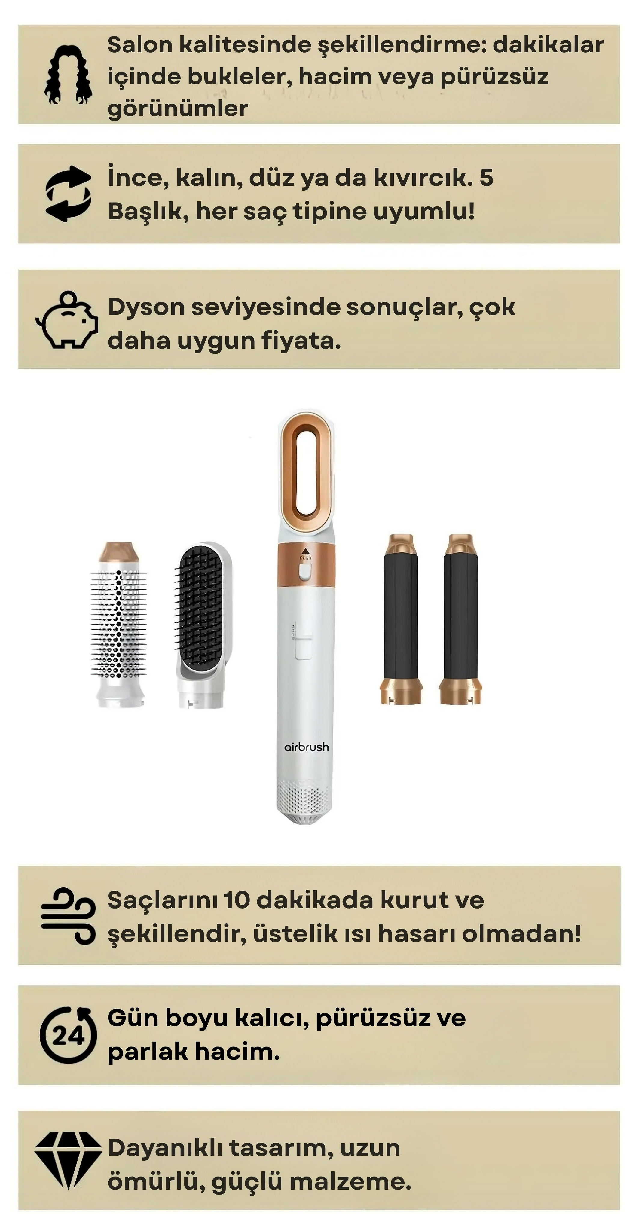 5'i 1 arada AirBrush, birkaç değiştirilebilir aparatla birlikte gelir: saç maşası, düzleştirici fırça, ısıtmalı tarak vb.
